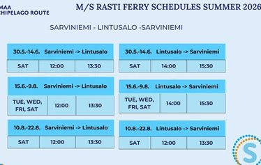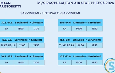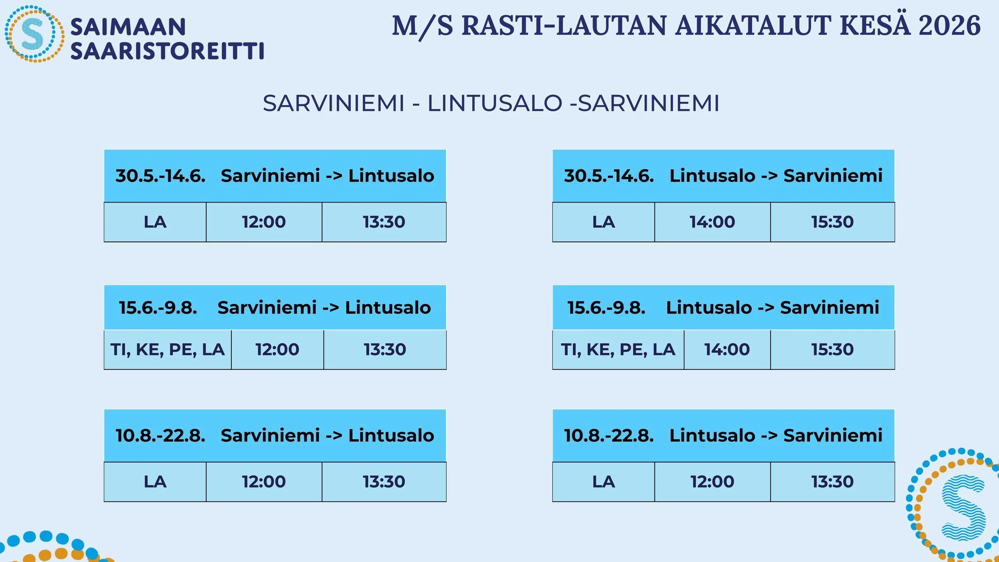 Lauttayhteys Saimaan saaristoreitiltä Puumalan saaristoreitille Etelä-Savon maakuntaan. Lähtö Sarviniemen virkistysalueelta, missä kannattaa varata aikaa tutustua upeaan virkistysalueeseen, joka on myös Saimaa Geoparkin kohde.
