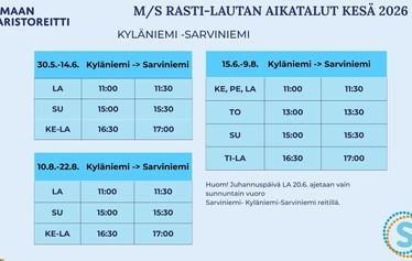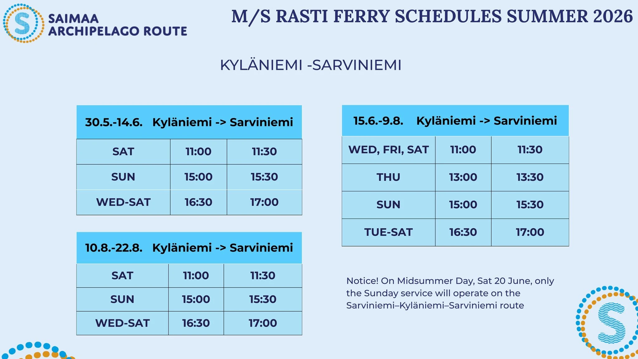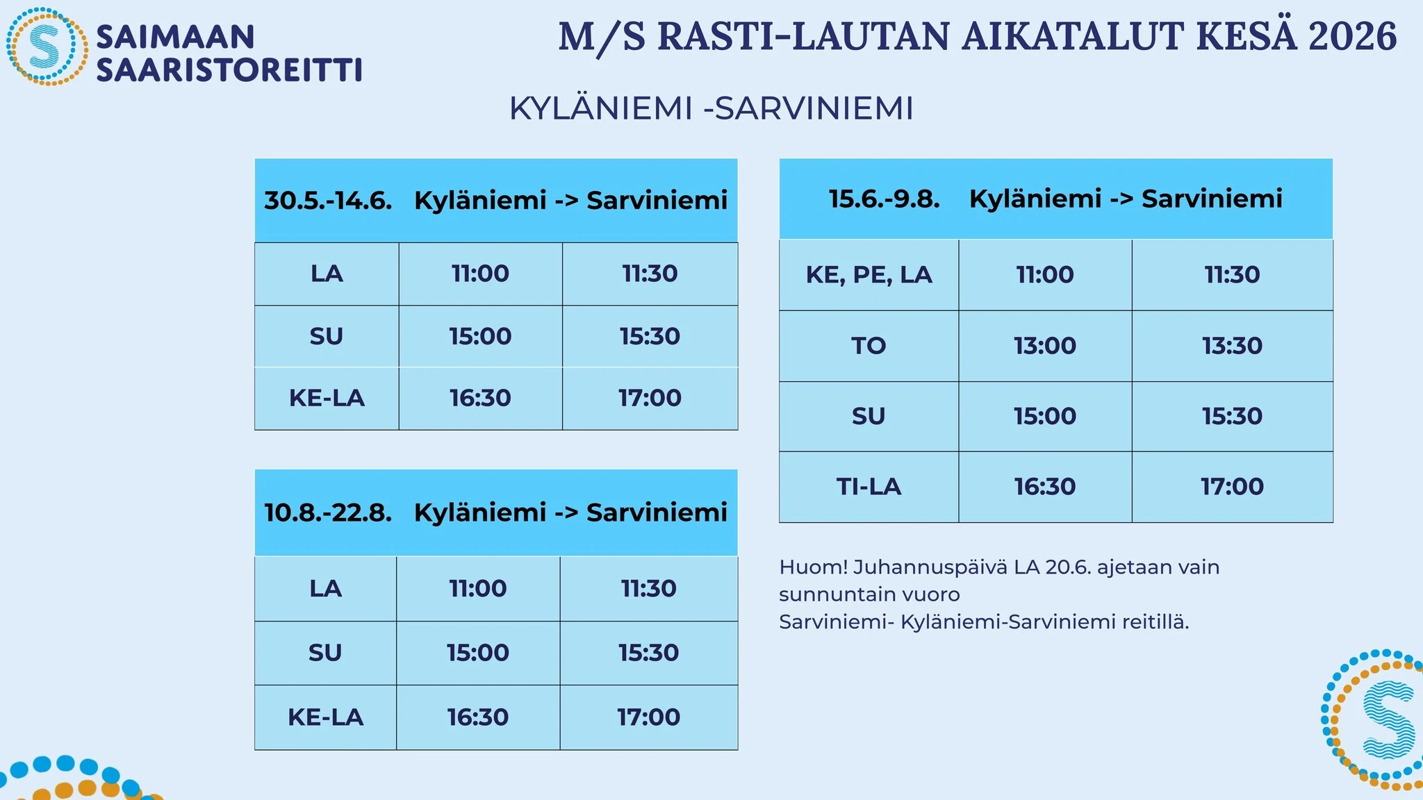 Saimaan saaristoreitin lauttaylitys reitillä vastapäivään ajettaessa (lautan kulkusuunta idästä länteen). Lähtö Kyläniemen kalasatamasta.